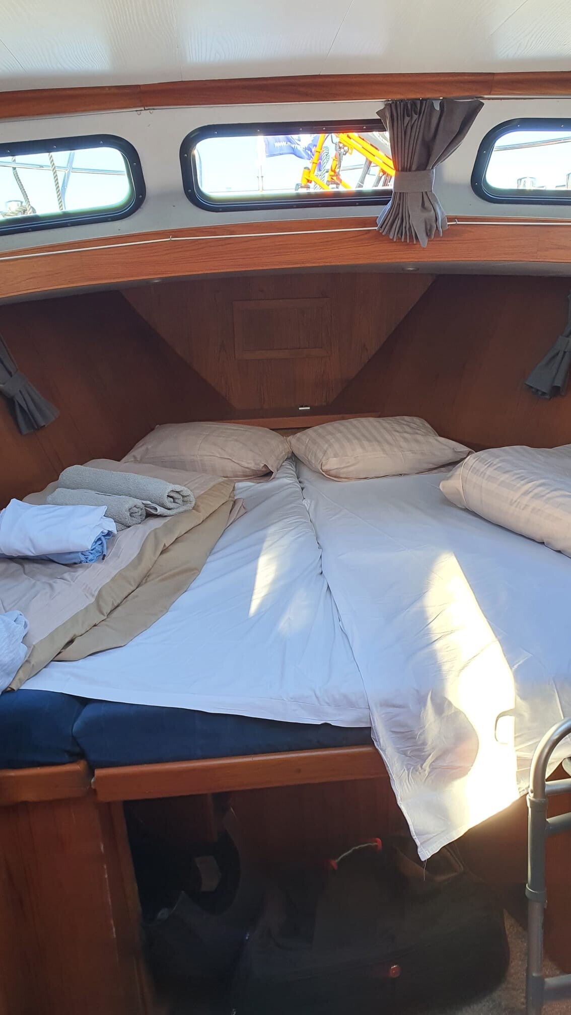 Alles was meine Prothese🦿und ich brauchen, ist an Bord. Platz zum schlafen 😴, zum duschen 🚿, zum zurückziehen 📖, zum quatschen, genügend Proviant, und das wichtigste, gute Freunde 🤝! Alles da.