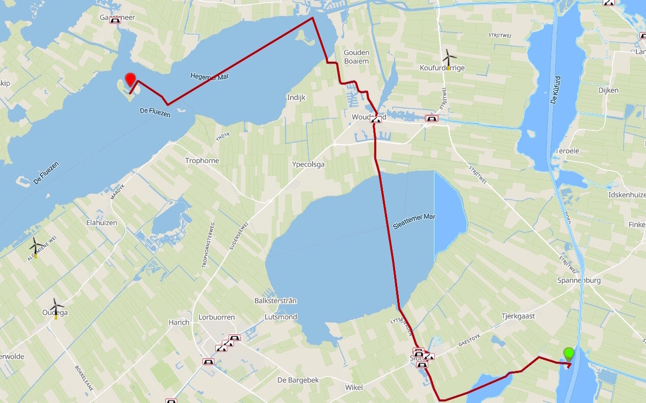 Hier ist die gesamte Strecke, die wir am siebten Tag vom Liegeplatz des Abends zuvor (grüner Punkt) bis zum heutigen abendlichen "Marrekrite Koarte Fliet FL11" Liegeplatz (roter Punkt) gefahren sind.