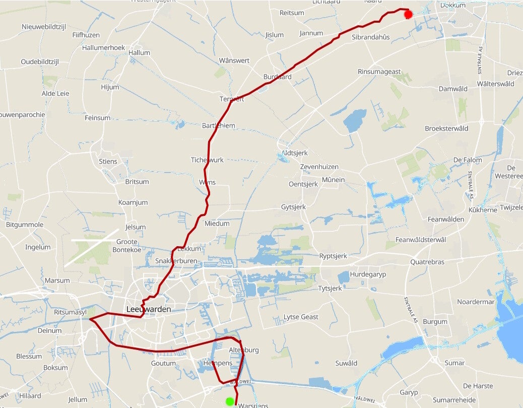 Hier siehst du die gefahrene Strecke an unserem ersten Tag, von der "Zijda Yachting Marina Jirnsum" (grüner Punkt) bis zum abendlichen "Marrekrite PR28" Liegeplatz (roter Punkt)